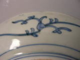 直径46センチの大皿です。これだけ大きくても描いてある文様は小皿並みに細かいという品です。右の拡大写真を見ても、そのことがよくわかります。江戸後期も終わりのほう19世紀になってからのものでしょう。ナス色を帯びた呉須の色、そして線描きの文様からそのように判断できます。